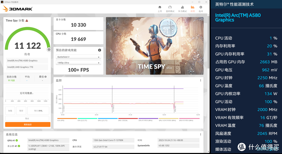 参数方面,蓝戟 intel Arc A580 Index使用的是公版方案,默认频率1700MHz,睿频最高2400MHz,但是受制于134W的功耗限制,睿频一般会维持在2100~2250MHz之间,此时的TimeSpy显卡成绩为10330,个人觉得功耗和频率设置有点保守了。