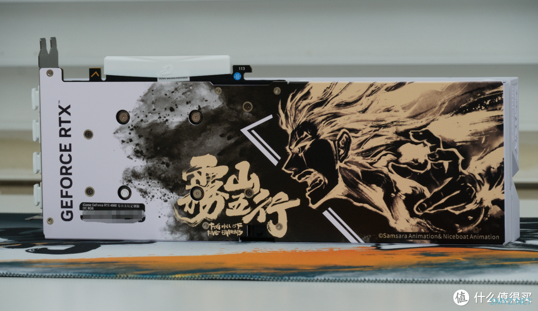 ▲先来看显卡的外包装,本次iGame GeForce RTX 4060 雾山五行定制版显卡的外包装也采用了动漫的水墨风设计,黑白水墨的主人公火行闻人翊悬位于右侧,怒吼的表情与手向前伸出给人一种终结谷决斗的感觉,就差喊一句“SA SU KE”了,对不起,我串戏了,手动狗头。