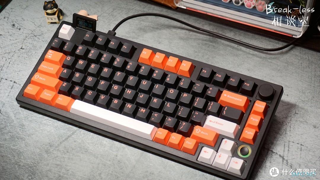 今年75配列的机械键盘产品尤其火爆,整把75配列键盘的尺寸和一把正常配列104键盘的主键位区大小相当,而75配列也有着完整的F区,上下左右按键,大部分的75配列键盘也都有配置旋钮来进行一些辅助调节,应该说除了没有小键盘区,75配列的功能相当齐全。再加上尺寸非常小巧,在“寸土寸金”的桌面上那还是相当难得的。