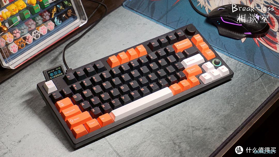 XS75T使用了目前比较流行的GASKET结构,夹心棉+轴下垫+底棉+硅胶底垫的配置对手感提升和杂音控制有很明显的作用,同时也是HELLO GANSS旗下第一款GASKET结构产品;有线,2.4G,蓝牙三模、原厂高度PBT二色成型键帽、1680万色RGB背光、连背部都有RGB灯条配置,旋钮+摇杆可以在驱动内进行相关设置,可以说这把键盘配置上该给的可一点儿都不含糊。定位板单独开槽,PCB单独开槽也是展现出了品牌工艺控制的过硬。键盘上有一块1.14英寸的可翻转彩屏,排线测试过可以承受4000次折叠,用作显示基础参数或者可自定义各种图片和GIF,也是最近机械键盘产品里可玩性比较高的设计,要可爱还是鬼畜那可就看各位发挥潜力了;