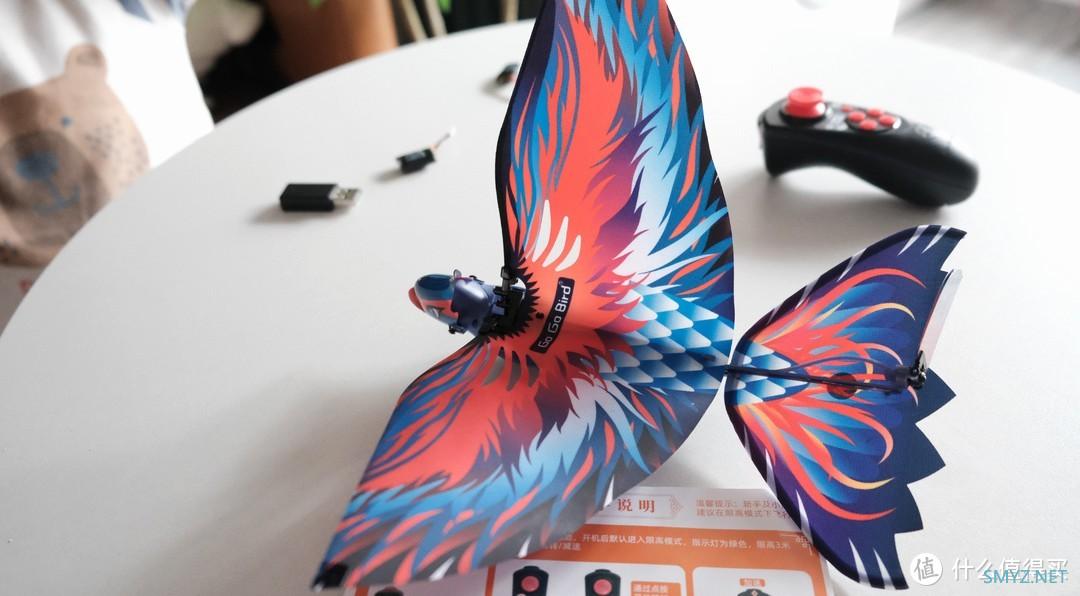 这款飞行器的做工非常不错,并没有市面上产品的廉价感,送给孩子的时候非常喜欢。第一眼看起来有点像风筝,整个鸟身采用全包型设计,很多的芯片、电器件都在鸟身内部,所以不用担心会轻易损坏。