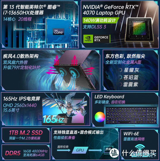 显卡方面,RTX 4070 Laptop是NVIDIA公司推出的一款基于Ada Lovelace架构的移动GPU。它采用了AD106核心,拥有4608个流处理器和8GB GDDR6显存,基础频率为1655MHz,加速频率可达2030MHz。该GPU支持第三代RT Cores和第四代Tensor Cores,并采用了TSMC 4N NVIDIA定制工艺,能效比大幅度提升。此外,RTX 4070 Laptop还支持包含DLSS 3功能在内的第五代Max-Q技术。