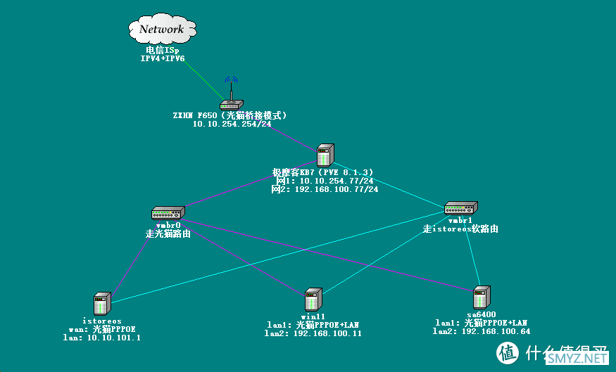 Win11精简版:4CPU+4G+100G+100G+2网卡(桥接vmbr0、vmbr1),主机名:Win11 23H2精简版,支持核显直通,目前声卡无输出,和黑群晖只能实现一个核显支持当然可以根据喜好调整资源配置。五、网络架构规划: