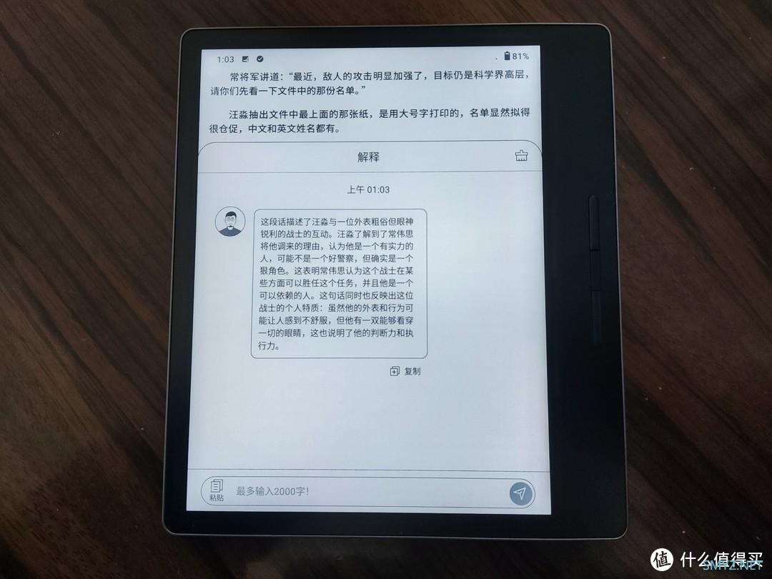 甚至于,你还能让AI来给你解释选中这款文字的含义,汉王基于30年人工智能技术沉淀自研的AI大模型,在语言文字方面的处理可谓是非常强大。有了汉王Clear,家里小朋友的语文作业再也不用愁了,什么了解段落大意,什么本段话表达了作者怎样的心情……通通信手拈来。当年我要是有这神器,何至于语文成绩不及格啊。
