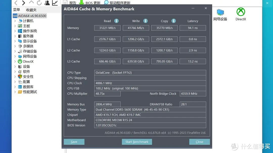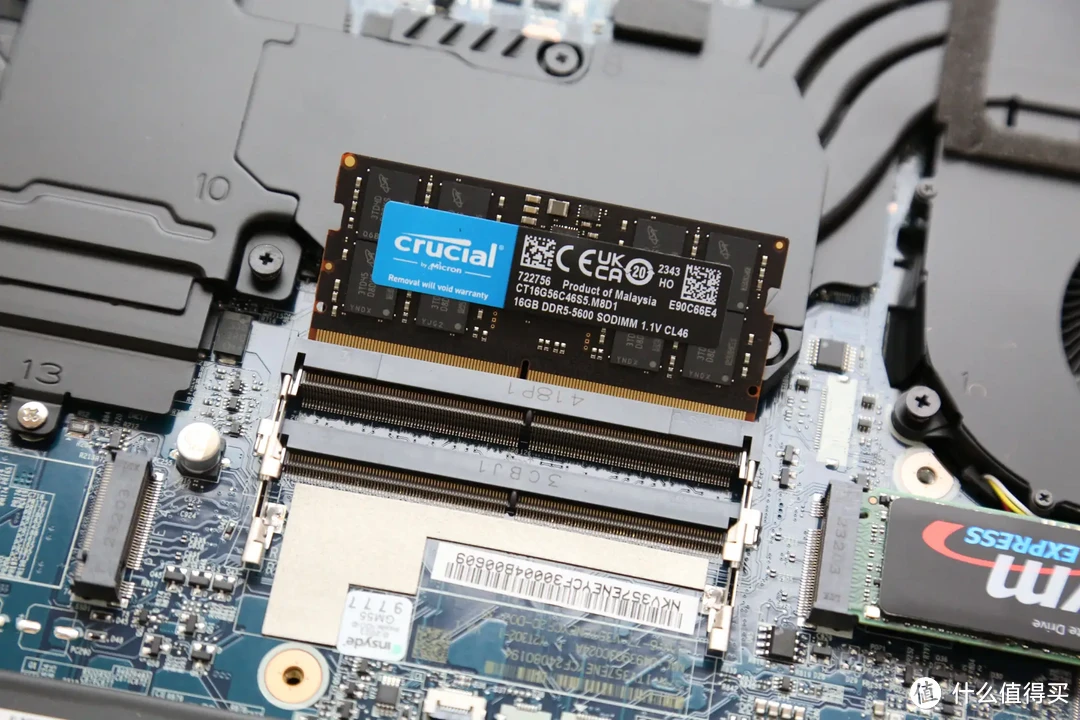内存这块可能有点仁者见仁智者见智了,虽然有两个插槽但出厂只预装了一条英睿达16GB DDR5 5600单通道内存,优点是单通道内存能够减少用户的购机价格,方便用户后续自行升级。缺点是比双8的双通道损失了一丢丢性能。从我们的测试来看,这台机器的内存表现还算不错,读取速度达到31221MB/s,写入速度达到41766MB/s,延迟为94.1ns。