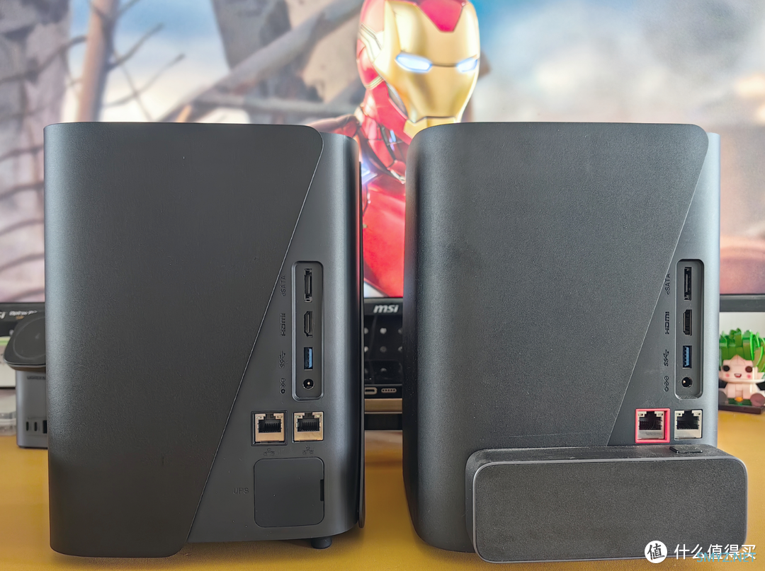 其它的配置就完全一样,比如说它们都是4个SATA机械硬盘位,并提供了两套双系统的32GB eMMC,I/O扩展接口都有2个USB3.2Gen2的A口、1个Type-C口、一个可以连接阵列柜扩容的eSATA接口,和一个支持HTPC模式的HDMI2.1接口。