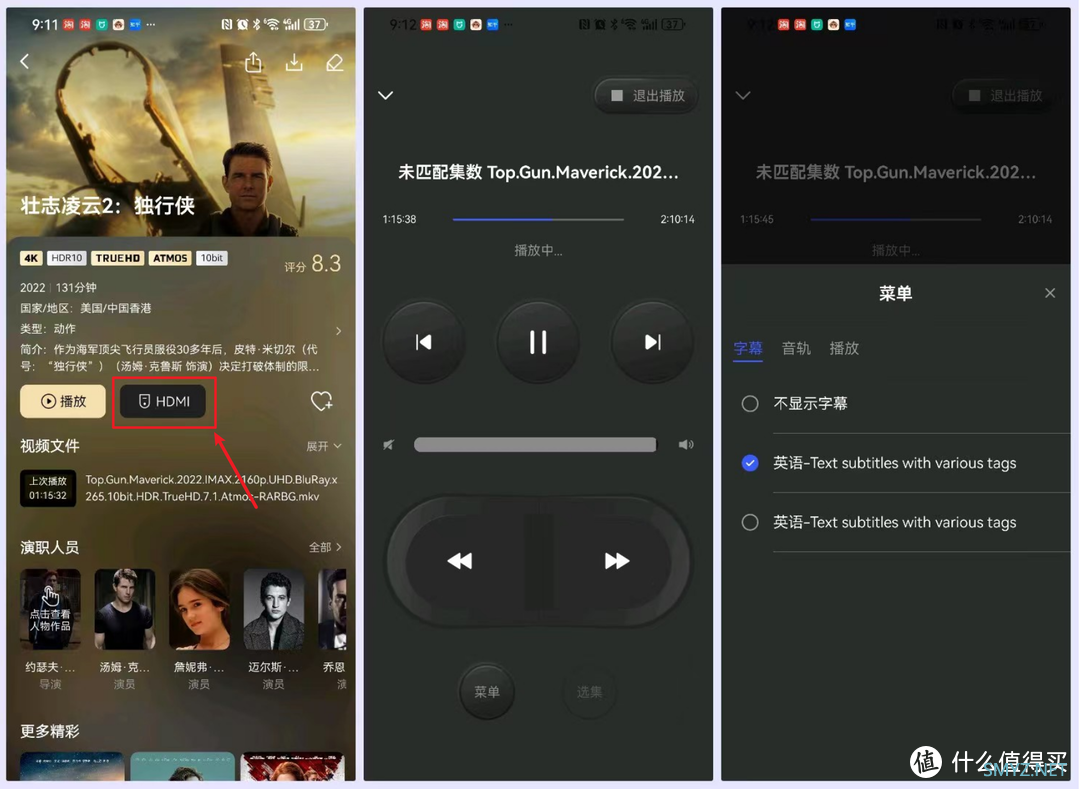 ????使用起来也是非常的简单,需要我们在手机上的极空间APP中打开极影视,然后在影片的详情页面有个HDMI的标识,选择打开即可。此时手机界面就变成了一个遥控器界面,可以播放暂停,也可以拖拽进度条播放等操作,或者选择字幕、音轨等。