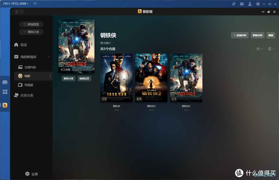 ????同时,对于一些系列电影,我们也可以通过“合集”的方式来管理,就比如说《铁人》三部曲,我们就可以直接将它们都放在一起展示。