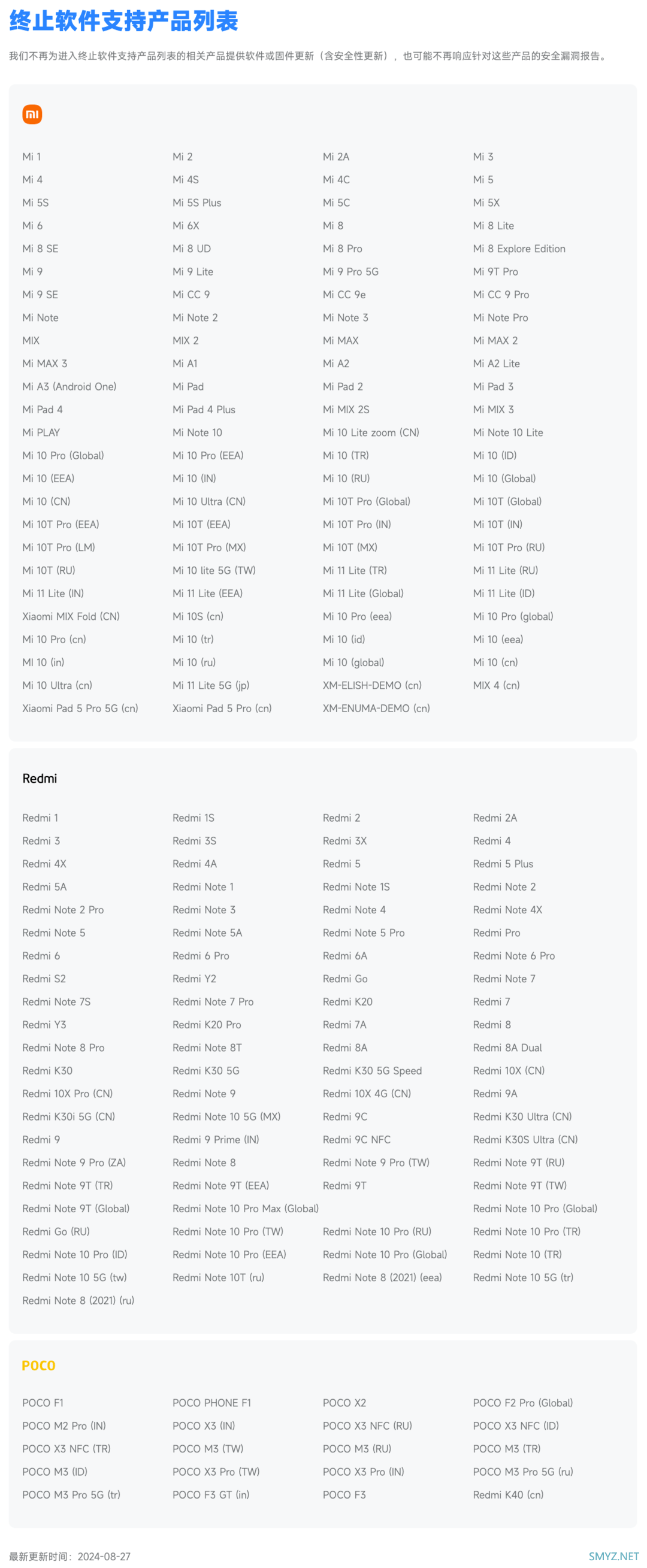 同时,小米产品支持政策显示,小米称其尽最大努力为旗下智能手机提供持续的安全性更新,覆盖小米、Redmi和POCO品牌的手机。小米提供的安全性更新包括最新的安全补丁、安全问题修复和其他安全性改进。通常情况下会为所有手机产品提供至少2年的安全性更新。