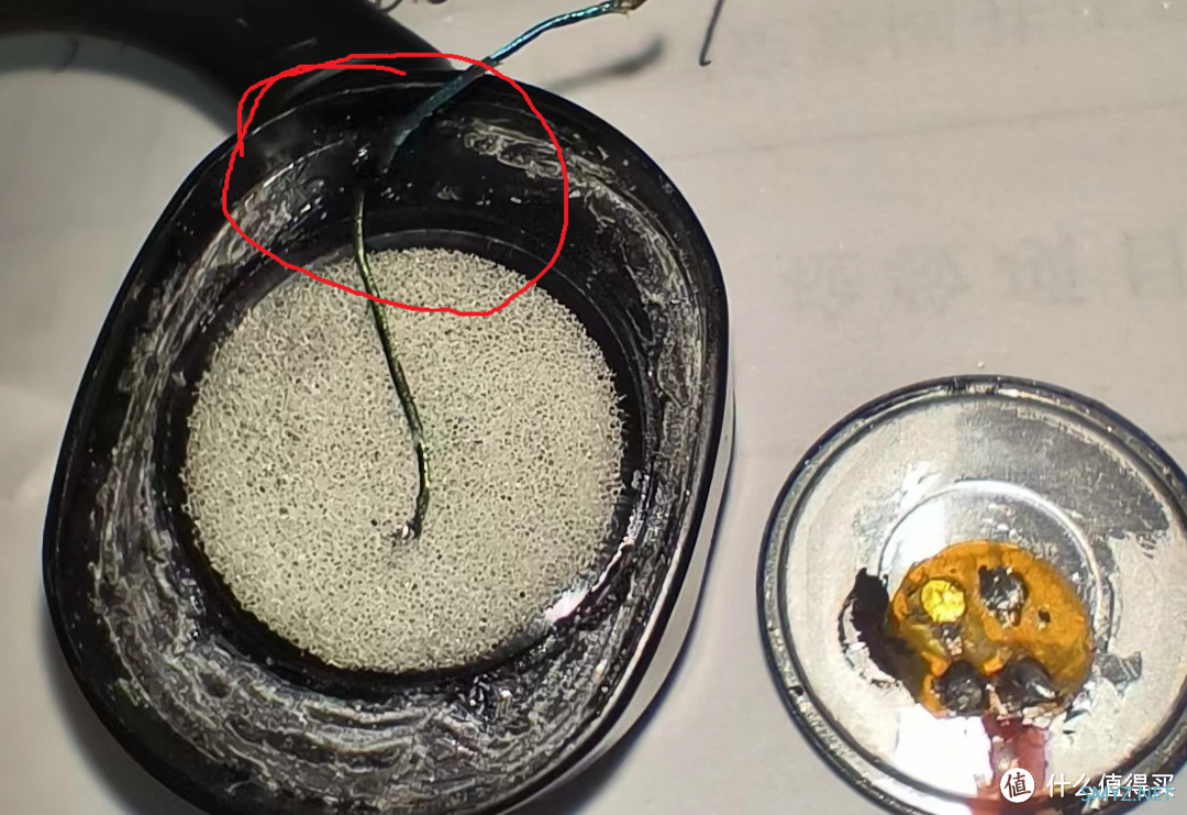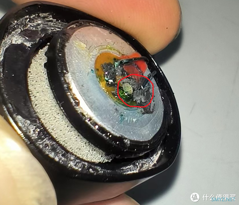 橡胶帽拆掉了,里面都是亮晶晶的液体,也不知道是汗液还是啥。中间红圈圈起来的地方是用黑色的软胶和动铁圈粘接的,我稍微用力给撕下来了。
