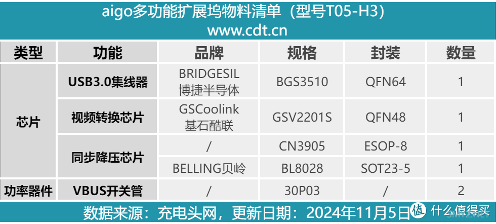 最后附上aigo多功能扩展坞T05-H3的核心器件清单,方便大家查阅。