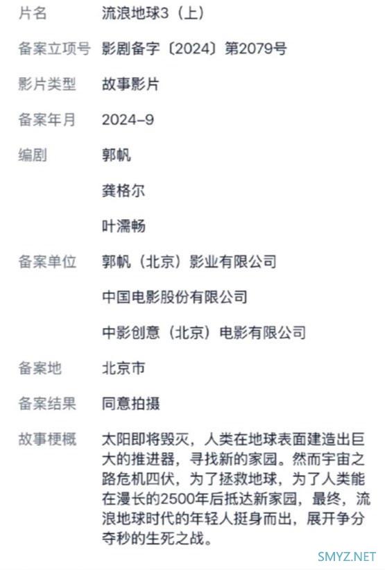《流量地球3》备案,分为上下两部:,国家电影局今日发布关于 2024 年 9 月下全国电影剧本(梗概)备案、立项公示的通知,备受关注的《流浪地球 3》将分为上、下部。