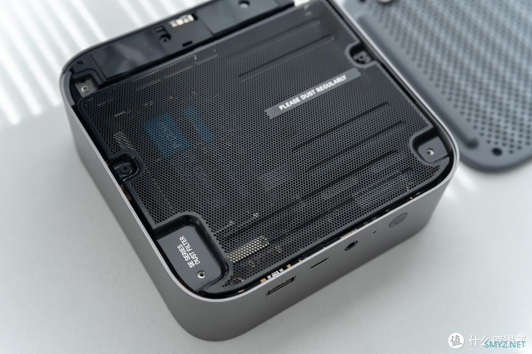 打开零刻SER8 8745HS迷你主机的底盖,首先映入眼帘的是一大片精致的金属防尘网。这一设计不仅有效防止灰尘侵入,保持内部清洁,而且便于日常的维护和清理。金属网的设置还确保了空气流通无阻,有助于维持主机内部的适宜温度。用户只需定期对防尘网进行简单的清洁,即可确保设备长期稳定运行。