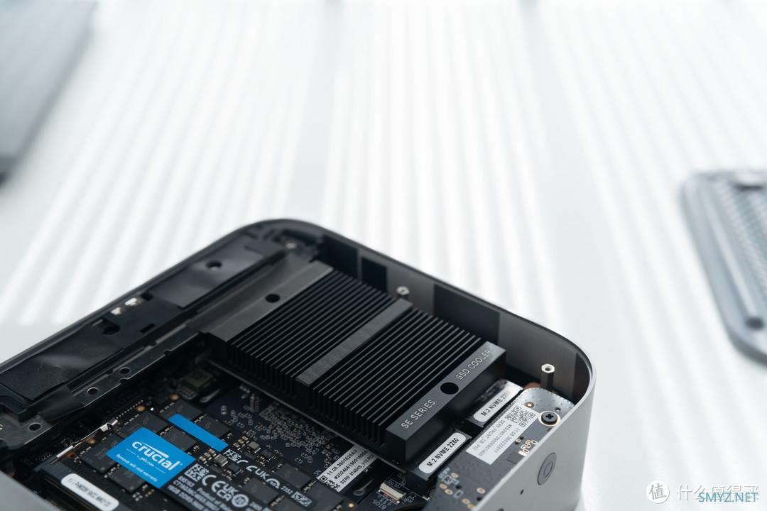 存储方面,零刻SER8 8745HS搭载了英睿达(Crucial)品牌的固态硬盘,采用2280规格的单颗粒配置,并配备了群联PS5021-E21主控,在硬盘位上配备了一个巨大的散热鳍片,固态硬盘在高速运行时会产生大量热量,而这个散热鳍片能够及时将热源散出,这对于固态硬盘的稳定运行至关重要,保证硬盘的高效稳定运行。
