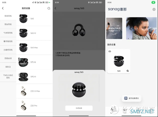 塞那S6S耳夹式蓝牙耳机还搭配有塞那耳机APP可以进行管理和细节功能的设置,先通过APP选择型号添加,轻松完成连接。