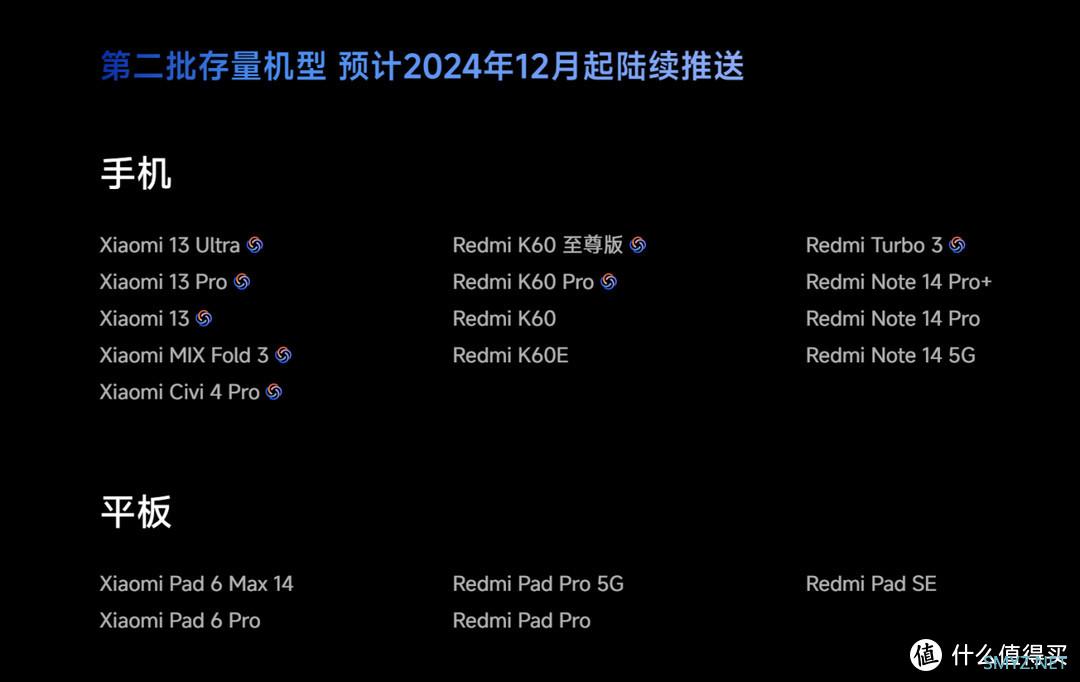 第三批将在 2025 上半年开始陆续推送,升级机型主要包括小米 12/11 系列、红米 K50 系列和红米Note 13/12/11 系列等,完整的适配支持机型名单如下: