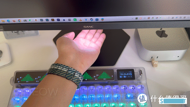 这个功能还是很实用的,屏幕下方有一个小灯,手掌挥一挥就可以照亮键盘,省去一个屏幕挂灯,很实用!