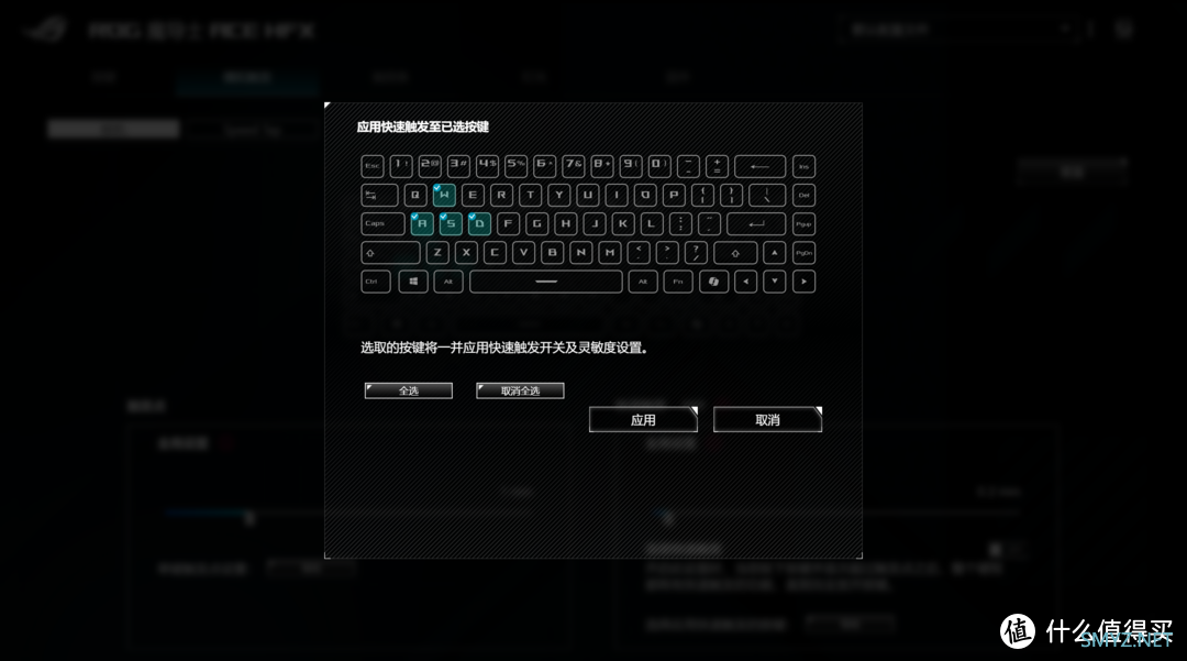 模拟触发的选项里面可以设置板机功能的触发点及快速触发设置,触发点的置默认为1mm,触发行程可在0.1-4mm之间进行0.1mm的精准设置,在开启RT功能后WASD键就会激发,还可以自行设置特定按键来应用快速触发功能▼
