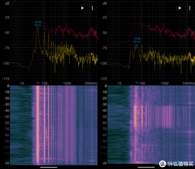 如果想要更专业的声音波形图谱也可以使用 Spectroid,比如这是我家音响的空载底噪: