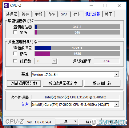 Xeon E3-1270 CPU-Z测试分数:单核:347.2;多核:1721.1