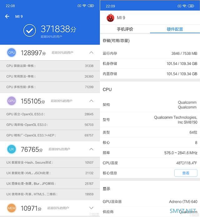 来自小米9的安兔兔跑分数据,其跑分综合成绩37万分,达到371838分。其中,CPU项成绩得分为12.8万,GPU项成绩得分为15.5万,UX项成绩得分为76765,MEM项成绩得分为10971。